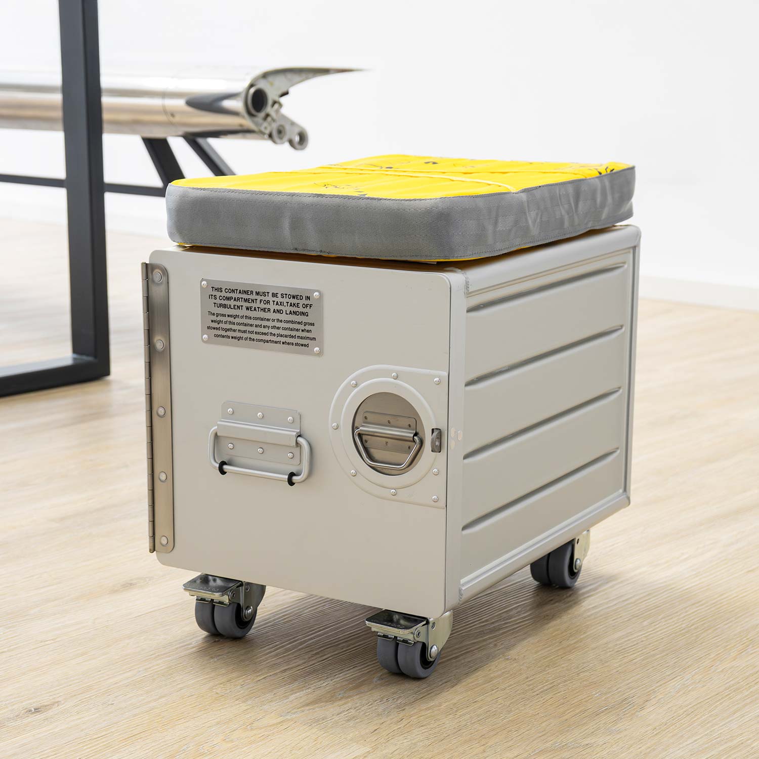 Der Korpus des Design-Möbelstücks ist eine originale Bord Box, die täglich auf den Flügen großer Fluglinien als stylischer Servicebegleiter zum Einsatz kommt. Unter der kreativen Hand des VanDeBord-Teams erhält die multifunktionale Cargo Box am Boden nun ein neues, charaktervolles Leben.