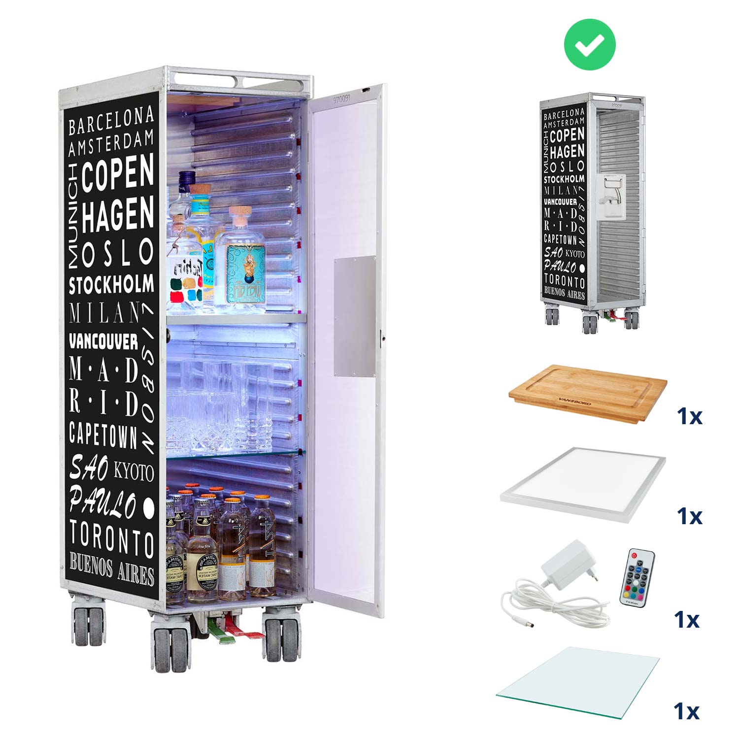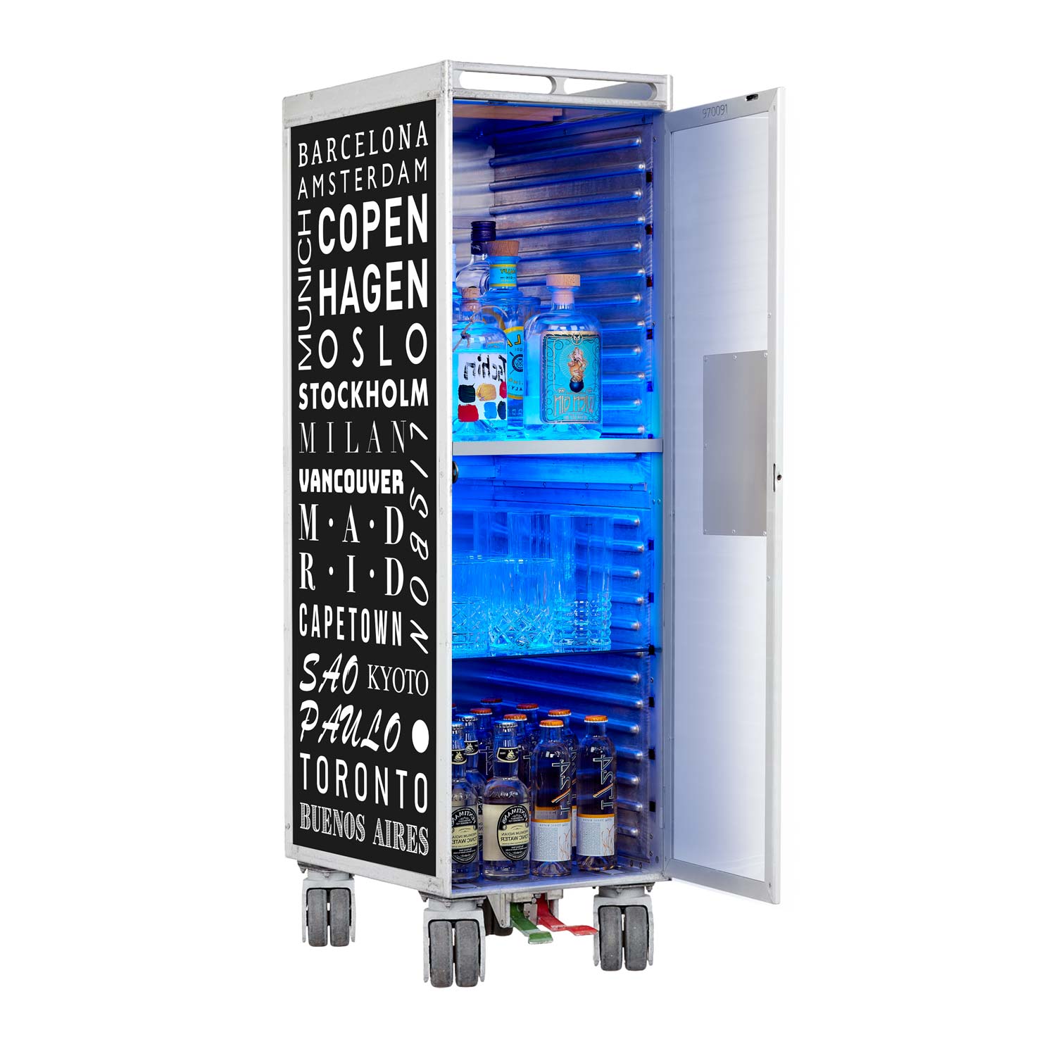 Was Mixgetränke wirklich speziell und besonders werden lässt, ist das Ambiente. Dies kann eine Bar sein oder auch eine fremde Stadt. Der Cosmopolitan Flugzeugtrolley als Bar hat Städtenamen mit Geschichte und Erinnerungen aus seinem früheren Leben auf seiner Haut und vereint diese miteinander.