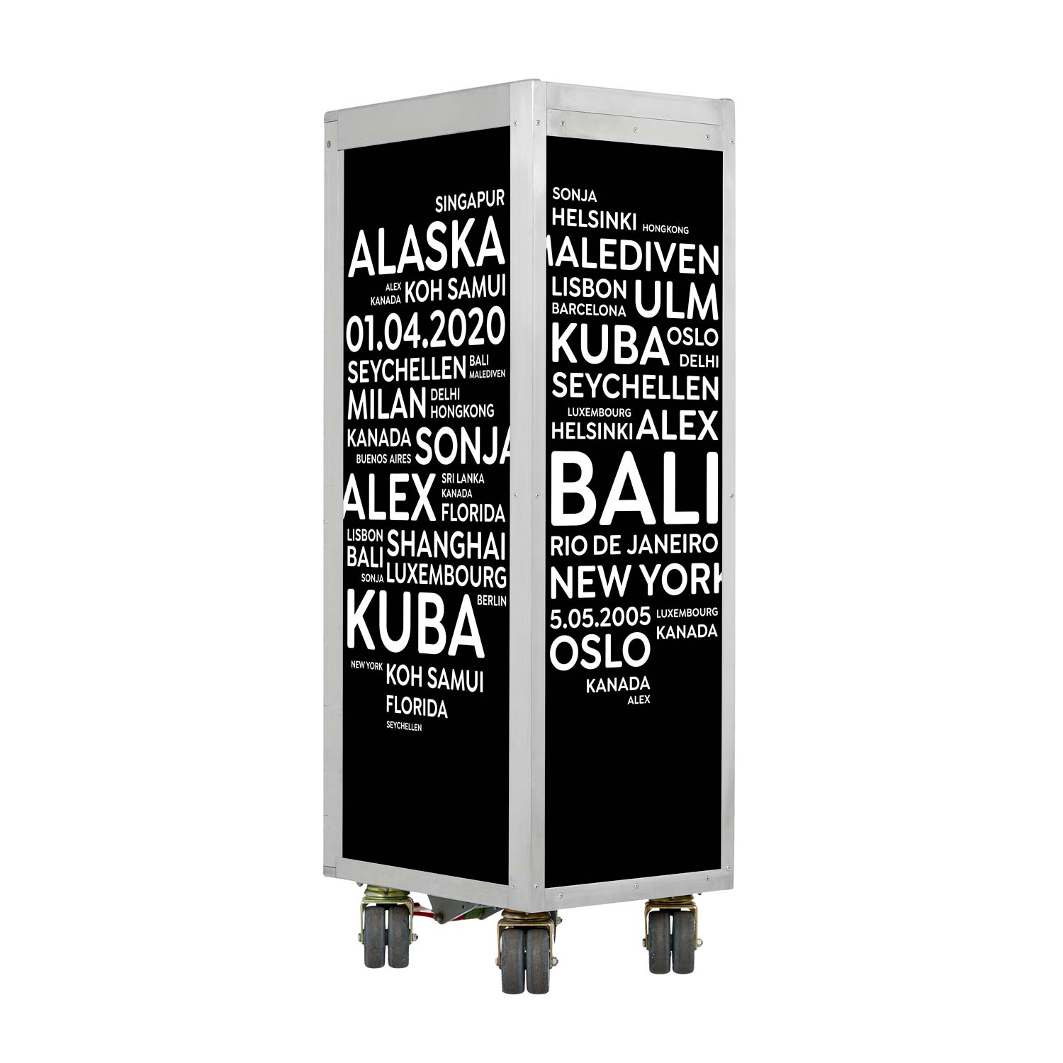 Dieser Flugzeugtrolley trägt Deine ganz persönliche Handschrift. Du wählst die Städte und Begriffe für das City Design aus und wir übernehmen alles Weitere. Ob Haupt-, Klein- oder Geburtsstadt, Hochzeits- oder Geburtsdatum, Lieblingsmusik, Spitznamen oder Meilensteine - wir designen nach Deinen Vorgaben Dein individuelles City Design.